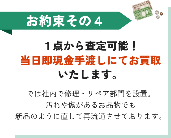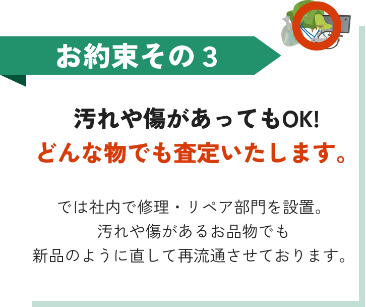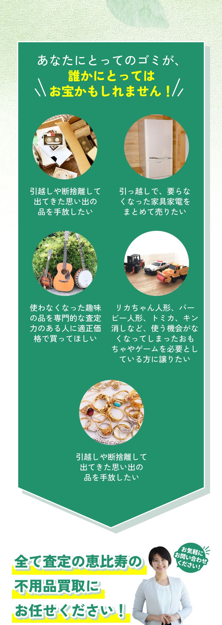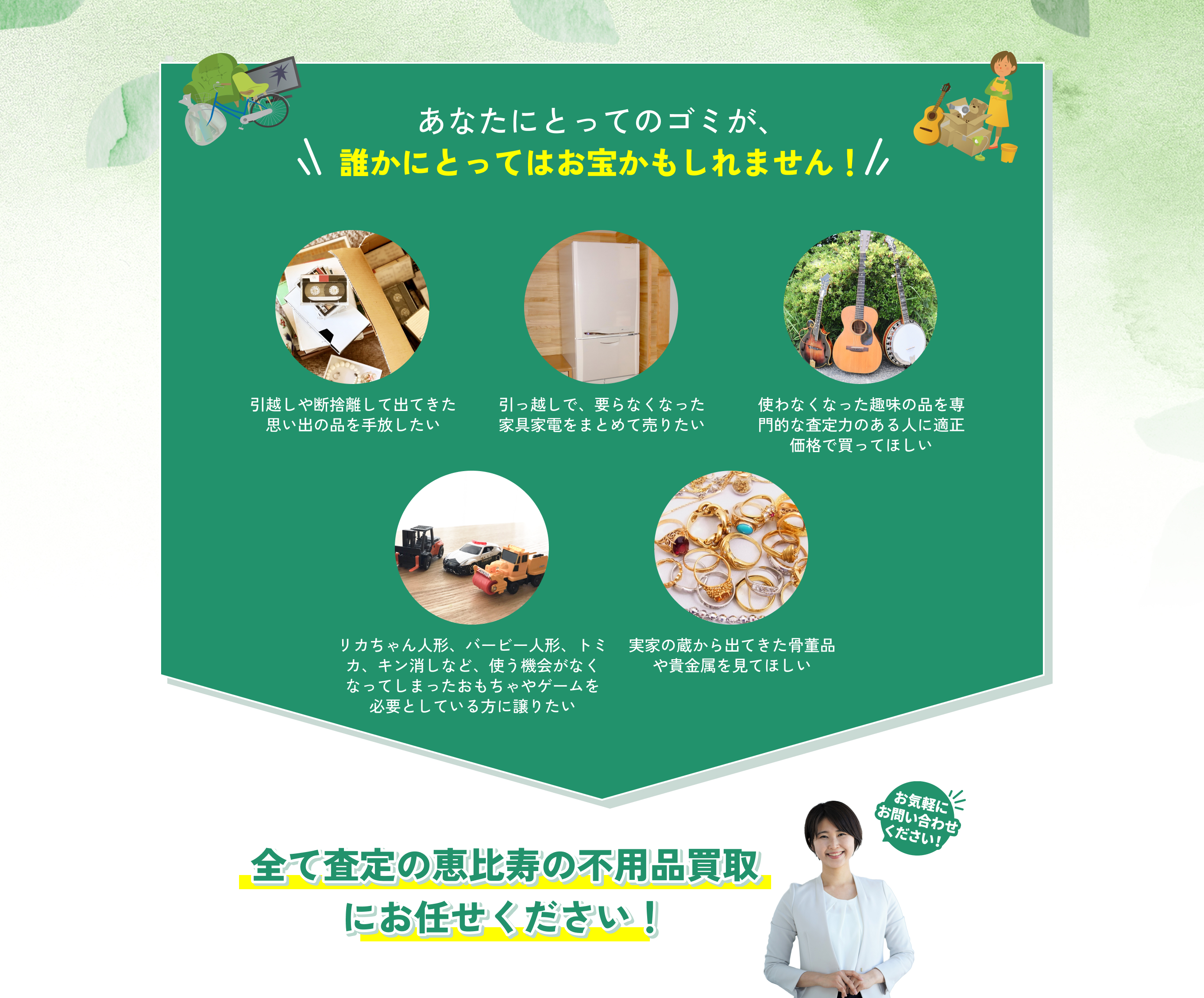 様々なジャンルのお品物を買取できるよう⼼がけています。しかしながら、⽇本の法令や条例に抵触するものなど、⼀部のお品物については買い取りができないものがございます。予めご了承ください。