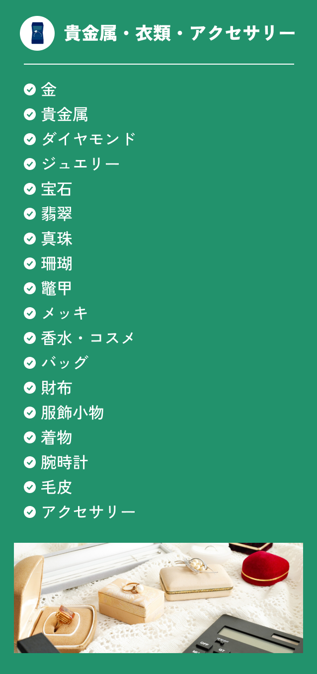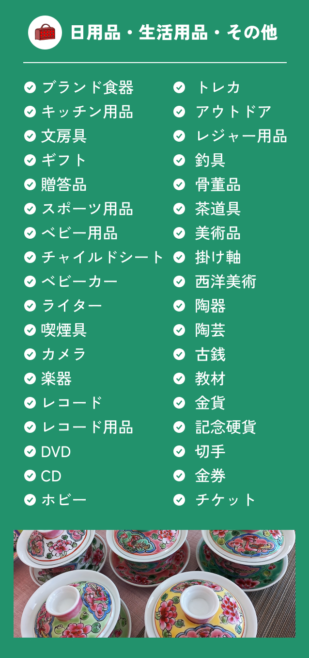 様々なジャンルのお品物を買取できるよう⼼がけています。しかしながら、⽇本の法令や条例に抵触するものなど、⼀部のお品物については買い取りができないものがございます。予めご了承ください。